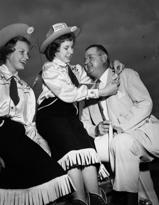 Janet Paine, left watches as her fellow cowgirl Marilyn Nelson, center, pins T. C. Jones, chairman of the highway committee of the Fort Worth Chamber of Commerce, with a U. S Highway 287 badge, which expresses Colorado's thanks for the road from Denver to Port Arthur. A 20-car motorcar arrived in Fort Worth for celebration of the highway's completion. Published in Fort Worth Star-Telegram morning edition May 23, 1952.
