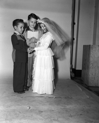 Principals in "The Wedding of the Flowers" by first and second graders at Lake Worth School will be Nancy Pritchard as the bride, Oscar McCaleb, the preacher, center, and Darrell Raymond, the groom. Published in Fort Worth Star-Telegram morning edition May 14, 1952.