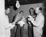 This group is selecting 15 broilers for entry in the state chicken-of-tomorrow program at Nacogdoches. Left to right, County Agent Glen Tole; Jimmy and Delbert Taylor, Everman 4-H Club boys; and Joe Fetchel of Western Hatcheries, Dallas. The four men are shown standing in a circle holding chickens. Published in Fort Worth Star-Telegram morning edition May 13, 1952