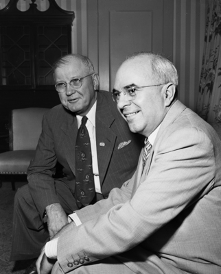 Making last-minute preparations for the state Republican Executive Committee session were Jack Porter of Houston, left, Texas campaign manager for General Eisenhower, and Alvin H. Lane of Dallas, co-chairman of the campaign. The two men are shown sitting and smiling together. Published in Fort Worth Star-Telegram morning edition May 13, 1952