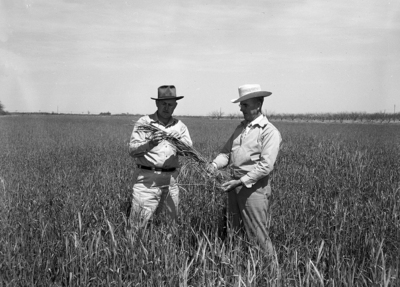 John Simpson, left, Soil Conservation Service technician at De Leon and W. H. Smith examine vetch and rye on a 150-acre field of Smith's that will be a peach orchard in the near future.
