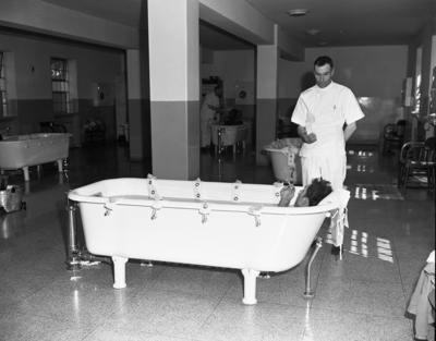 A patient at the U.S. Public Health Service Hospital soaks his nervousness and eliminates his tautness away in relaxing warm water. J. K. Penrod, tub therapy aide, looks on. A man is shown sitting in a bathtub while another man looks over him. Published in Fort Worth Star-Telegram morning edition May 13, 1952