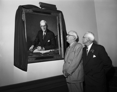 Marshall A. Fuller, right, chairman of the First National Bank, and J. Lee Johnson Jr., president, are shown viewing a painting of Fuller, painted by Douglas Chandor of Weatherford. Published in the morning edition, May 14, 1952