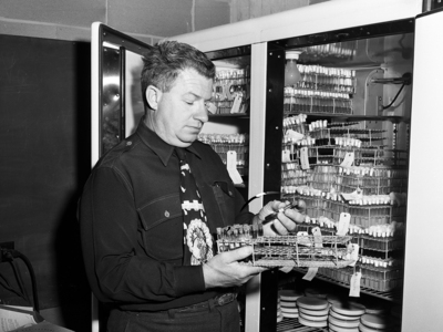 Jack D. English, director of the laboratory for pullorum testing at Tarleton State College, Stephenville, takes a look at blood samples that come in from turkey farms. Birds found affected are removed from flocks.