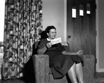 Mrs. Hubert Gadberry examines a letter that went through the storm. Three cards and paper place mat in her home were blown four miles by a tornado, and found on the farm of her mother-in-law. The tornado hit Olney, Texas one year prior on May 18, 1951. Published in Fort Worth Star-Telegram morning edition May 18, 1952.