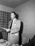 George D. Murphey of Galveston, (not shown) failed to get a second to his motion that Republicans select nominees for public office in a primary this year but a resolution, read by Carlos G. Watson, right, of Brownsville, secretary of the state Republican executive committee, calling for selection of nominees by convention as usual was passed unanimously by the committee. The image shows Carlos G. Watson speaking. Published in Fort Worth Star-Telegram, evening edition May 13, 1952