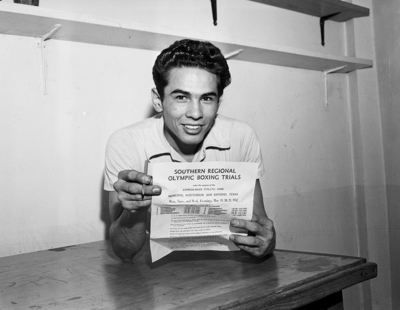 Image shows Ramond Riojas, a boxer, who would enter Olympics boxing trials, held at the Municipal Auditorium in San Antonio. Published in the evening edition, May 15, 1952.