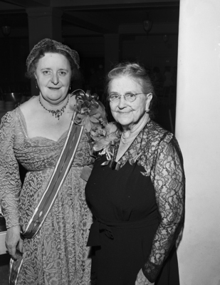 Mrs. H. C. Vandervoort, left, state president of the Daughters of the Republic of Texas (DRT), is shown with Mrs. Hally Bryan Perry of Alpine, one of the founders of the organization, at the opening meeting held in connection with the DRT state convention. Published in the evening edition, May 15, 1952.