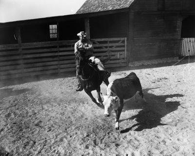 T. C. Jinkens, shown here on "Red Light", will be one of the competitors in the Fort Worth Horeshoe Club roping and cutting horse show on the club grounds on the Old Stove Foundry Rd. Published in Fort Worth Star-Telegram morning edition May 16, 1952.