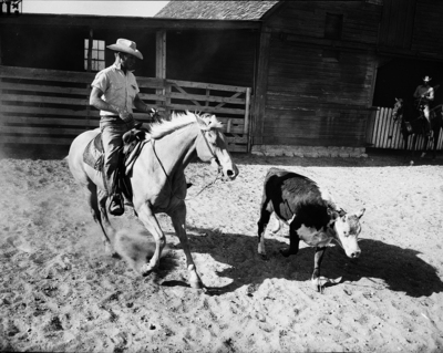 Mac, a double-registered Palomino cutting horse, keeps a calf at bay while Clyde Hightower of Fort Worth goes along for the ride. The combination while perform in the Fort Worth Horseshoe Club's cutting horse and calf roping competition. Published in Fort Worth Star-Telegram morning edition May 18, 1952.