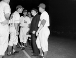 Manager Bobby Bragan, left, of the Cats gets in a final word before being thumbed out of the game by Umpire Edward Cassini. Bragan is protesting Cassini's ruling on Mel McGaha's homer in the eighth. Other Cats, left to right, are Pitcher Joe Landrum, Catcher Steve Lembo and infielder Jack Lindsey. Published in Fort Worth Star-Telegram evening edition, May 15, 1952.