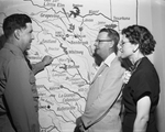 Major Morris S. Denman, left, who was in charge of the open house tours of the new Corps of Engineer Building at W. Vickery, shows two visitors where some of the projects under control of the Fort Worth District office are located. The visitors are Mr. Walter Maser of Galveston, center, and Miss Elise Lewis of Little Rock. Published in the evening edition, May 15, 1950.