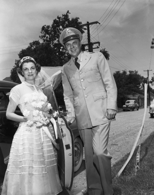Image shows Captain Samuel A. McMillan Jr., right, and his new wife, Mrs. McMillan, left, on their wedding day. The photo was taken outside. Published in the morning edition, May 16, 1950.