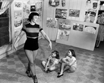 Janet and Nancy Jenkins watch the dancing legs of their mother, Mrs. Hansel Jenkins, dance director and choreographer for the Reeder Children's Theater. The children will appear in the school's 1952 production, "The happy Hypocrite". Published in Fort Worth Star-Telegram morning edition May 18, 1952.