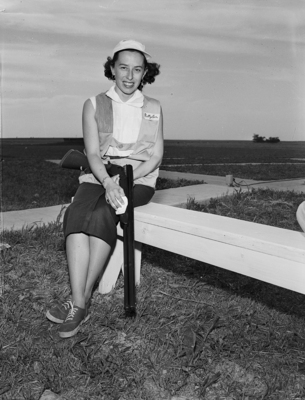 Betty Cox of Wichita Falls is the defending woman's champion in Texas Trapshooters' state meet now in progress at Fort Worth Gun Club. Published in Fort Worth Star-Telegram evening edition May 16, 1952.