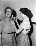 Mrs. Elizabeth Richardson got something nice-not an apple- upon retiring from teaching science at Lake Worth High School. She was honored at a school assembly when Myra Cook, student council president, made this presentation. Published in Fort Worth Star-Telegram morning edition May 18, 1952.