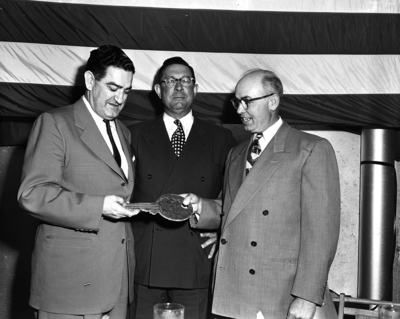 Jess Larson, left, chief of the General Services Administration, receives from O. P. Leonard, right, a glittering key symbolizing release of the new GSA records center and warehouse facilities to government use, while Colonel Karl E. Wallace, center regional GSA director, watches. Published in Fort Worth Star-Telegram evening edition May 16, 1952.
