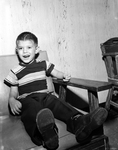 Tommie Yates, small boy who was beaten by his mother, shown sitting in chair at Baylor Hospital in Dallas. Published in Fort Worth Star-Telegram evening edition May 19, 1952.