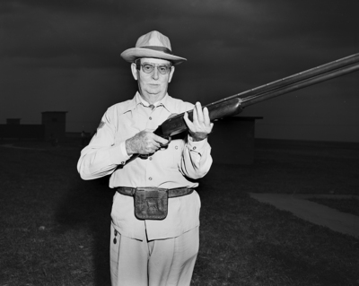 Trap shooter Forest W. McNeir is shown holding a weapon while posing for the camera in the Texas Trap shooters state meet. Published in Fort Worth Star-Telegram evening edition May 19, 1952.