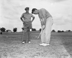 Ernie Vossler demonstrates chip shot to Ridglea invitation finals for Richard Patton after they advanced to championship round. They'll go 36 holes for the title trophy. Published in Fort Worth Star-Telegram morning edition May 18, 1952.