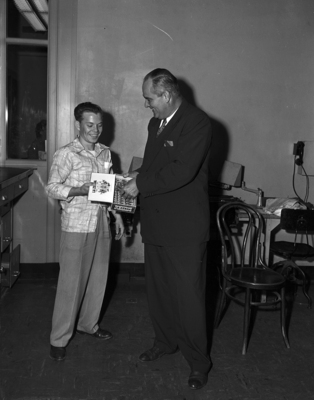 Bantamweight Bobby Joe of the wire room, who shakes the Fairbanks at 115 pounds exactly 100 pounds under Heavyweight Tony Slaughter at right, passes out cigars for that 7 pound 5 1/2 ounce boy, Bobby Joe born May 19.