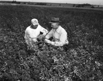 Joe Hatcher, left, and Floyd Jones, Tarrant County FHA supervisor, discuss possible seed yields from Hatcher's second-year Madrid sweet clover. Published in Fort Worth Star-Telegram morning edition May 25, 1952.