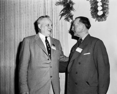 G. J. Sherrard, left, of Boston, was a speaker at Hotel Texas at the 45th annual convention of the Texas Hotel Assocation. At right, General O. Thompson of Amarillo, Texas railroad commissioner, and owner of two Amarillo hotels. Published in Fort Worth Star-Telegram evening edition May 20, 1952.