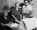 Three workers for the Tarrant County chapter, American Cancer Society, make medical dressings for cancer patients. Left to right, Mrs. Arch Parnum of Lake Worth, Mrs. Edward Nowak and Mrs. F. W. Digby-Roberts. Published in Fort Worth Star-Telegram morning edition May 21, 1952.