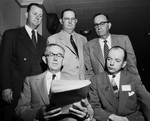 R. L. Miller Jr. of El Paso, lower right, was named president of the Texas Hotel Association. Also seated is J. Tip Newell of Sherman, outgoing president. Standing, left to right, are M. Jack Ferrel of Houston, first vice president; Rufus Wallingford of Abilene, second vice president, and M. M. Seymour of Jacksonville, third vice president. Published in Fort Worth Star-Telegram evening edition May 21, 1952.