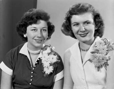 Mrs. Jo Ann Simmons, left, and Mary Ruth Pittman, two of the season's graduates at Paschal High School, were honored at a tea. Their parents are Mr. and Mrs. Guy Pittman, 2620 South Jennings, and Mr. and Mrs. Roy Simmons, Kennedale. Published in Fort Worth Star-Telegram morning edition May 28, 1952.