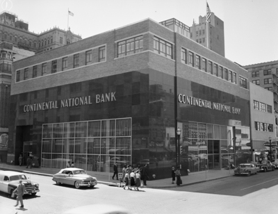 Continental National Bank, opening of new building: exterior shot of building. This building of pink Roman brick and Swedish marble is the new home of Continental National Bank at W. 7th and Houston. The building has two basement levels and four floors above, embracing 70,000 square feet of floor area for banking quarters. Published in Fort Worth Star-Telegram evening edition May 29, 1952