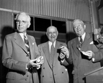 Karl Hoblitzelle, left, founder of the Hoblitzelle Award for agriculture contribution, and R. L. Thornton, right, show off the watch and cigarette lighter "awards" presented to them by Amon Carter at Renner. The three were at the presentation of the $5,000 Hoblitzelle Award to Charles E. Fisher.