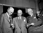 Karl Hoblitzelle, left, founder of the Hoblitzelle Award for agriculture contribution, and R. L. Thornton, right, show off the watch and cigarette lighter "awards" presented to them by Amon Carter at Renner. The three were at the presentation of the $5,000 Hoblitzelle Award to Charles E. Fisher.