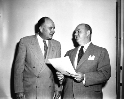 Edwin M. Clark of St. Louis, right, Southwestern Bell Telephone Company president, explains to Ed Ernest, left, Fort Worth division manager. Published in Fort Worth Star-Telegram morning edition May 22, 1952.