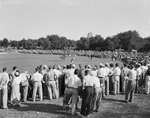 Part of the huge gallery watching the pre-tournament clinic at Colonial is shown here. Officials estimated turnout at 4,000 and upped the tournament pot from $15,000 to $20,000 as result of the first day showing. Several of the top-name pros are demonstrating shots for the fans. Published in Fort Worth Star-Telegram morning edition May 22, 1952.