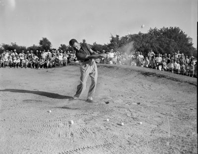 Jack Burke Jr. demonstrates how to get out of sand trap at Colonial golf clinic. Burke is one of favorites for $20,000 tournament. Published in Fort Worth Star-Telegram evening edition May 22, 1952.