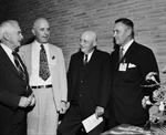 Old grands and dignitaries gathered in Sherman to dedicate two new Austin College buildings. Left to right, Dr. James K. Thompson of Fort Worth, Dr. W. B. Guerrant president of the College; Sam Rayburn of Bonham, Speaker of the House, and Henry Frnka, athletic director at Tulane University. Published in Fort Worth Star-Telegram morning edition May 23, 1952.
