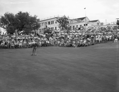 Joe Conrad sinks a six-foot putt for a par and his tying 68 on the 18th green at Colonial. The North Texas State student and Raymond Gaffor, Northwood pro, finished in a deadlock for the first day lead. Conrad scored a birdie on 17, and needed a one-putt green on 18 for the tie. Published in Fort Worth Star-Telegram morning edition May 23, 1952.
