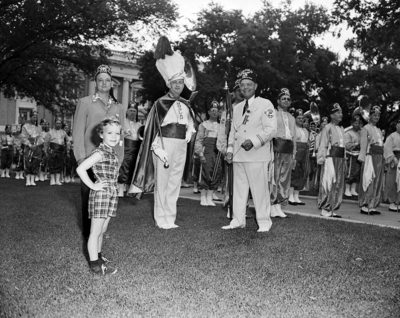 Little Shivers And Shriners - Marialice Sue Shivers, 5, daughter of Governor Shivers, greets the Fort Worth Moslah Temple band at the governor's mansion in Austin. Left to right are Marialice, Jax Maxwell, Sproesser Wynn and Colonel N. J. Whitehurst, band director.