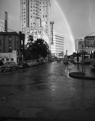 A brilliant, colorful rainbow ached around downtown building just before sundown as rain stopped falling for a while. This picture, with the vivid band plunging earthward in the background, was taken looking south at 5th and Lamar. Published in Fort Worth Star-Telegram evening edition May 24, 1952.