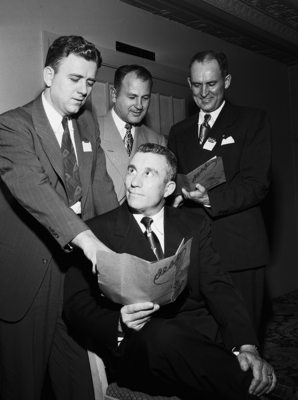 Checking discussion groups on the program of the South Central regional conference of elementary school principals at Hotel Texas are, left to right, Herman Newsom, Abilene; Lennon Hill, Lubbock; E. B. Fincher, Wichita Falls, and Robert Birchfield, Amarillo.