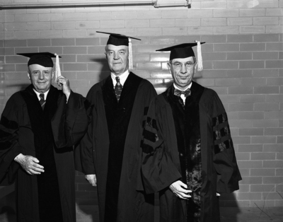 Honored by Austin College, left to right, speaker Rayburn, Louis Calder of New York, one of the organizers of Southland Papermills, and Houston Harte, San Angelo publisher. They received doctor of humanities and doctor of laws degrees. Published in Fort Worth Star-Telegram evening edition May 23, 1952.