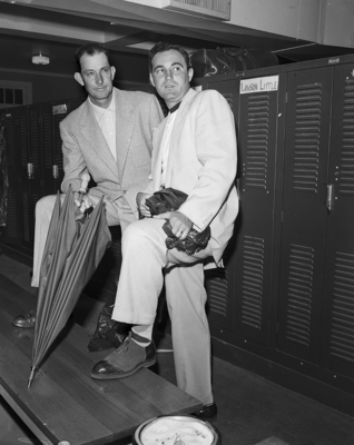 Raymond Gafford, left, co-leader with a 68 after the first round, and Doug Ford, 70, chat in locker room. Published in Fort Worth Star-Telegram morning edition May 24, 1952.