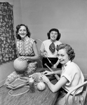Misses Beverly Thomas, Dolores Heckathorne and Sue Copeland, left to right, go over the equipment they plan to use at the Young Woman's Christian Association Commuter's Camp which opens on Eagle Mountain Lake. Published in Fort Worth Star-Telegram evening edition May 26, 1952.