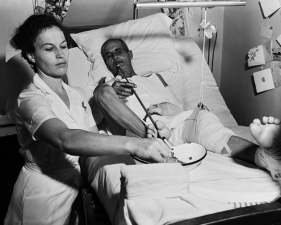 Mrs. Maxine Howdeshell wield the cigarette lighter her patient, Clyde W. Ashmore, can enjoy a smoke. His novel holder was fixed up after an accident left Ashmore unable to bend either arm. Published in Fort Worth Star-Telegram morning edition May 25, 1952.