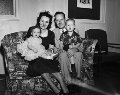All eyes were on children when Fort Worth district Methodist ministers and their wives met for an annual luncheon. Displaying Jimmie, 3, and Beverly Lynn, 9 months, are Reverend and Mrs. James Campbell of Benbrook. Beverly is one of 12 babies born in the district parsonages in the previous year.