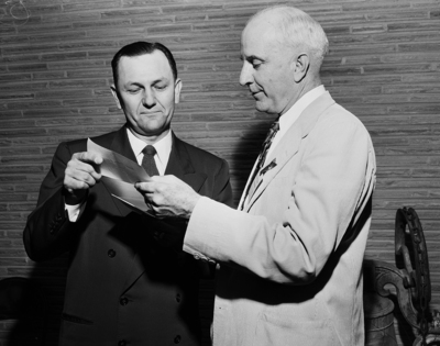C. K. Davis chairman of the Sherman Chamber of Commerce fund raising committee, presents a check for $110,000 as the gift of the citizenry to Dr. W. B. Guerrant, right, Austin College president, for a student union building. Published in Fort Worth Star-Telegram morning edition May 26, 1952.