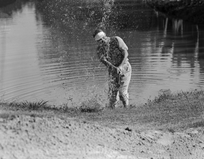Jimmy Thomson sprays himself with water as he blasts his ball from the lake on No. 16 at Colonial. He landed on par 3 green but took 5 shots. Published in Fort Worth Star-Telegram morning edition May 25, 1952.