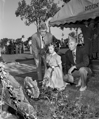 In memory of her own and other fathers killed in battle, Susan McCarty kneels after placing her wreath at the foot of Doughboy Monument in Mount Olivet. With her are John Hawn, left, and Jess Roberman, representing Fort Worth Voiture 1185, 40 & 8. They participated in the annual Memorial Day service. Published in Fort Worth Star-Telegram morning edition May 26, 1952.