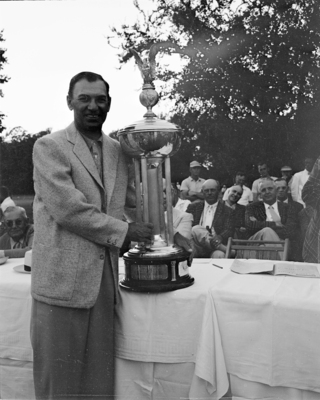 Ben Hogan with his winning trophy from the National Invitation Golf Tournament held at the Colonial Country Club in Fort Worth. Behind him, are spectators sitting down.